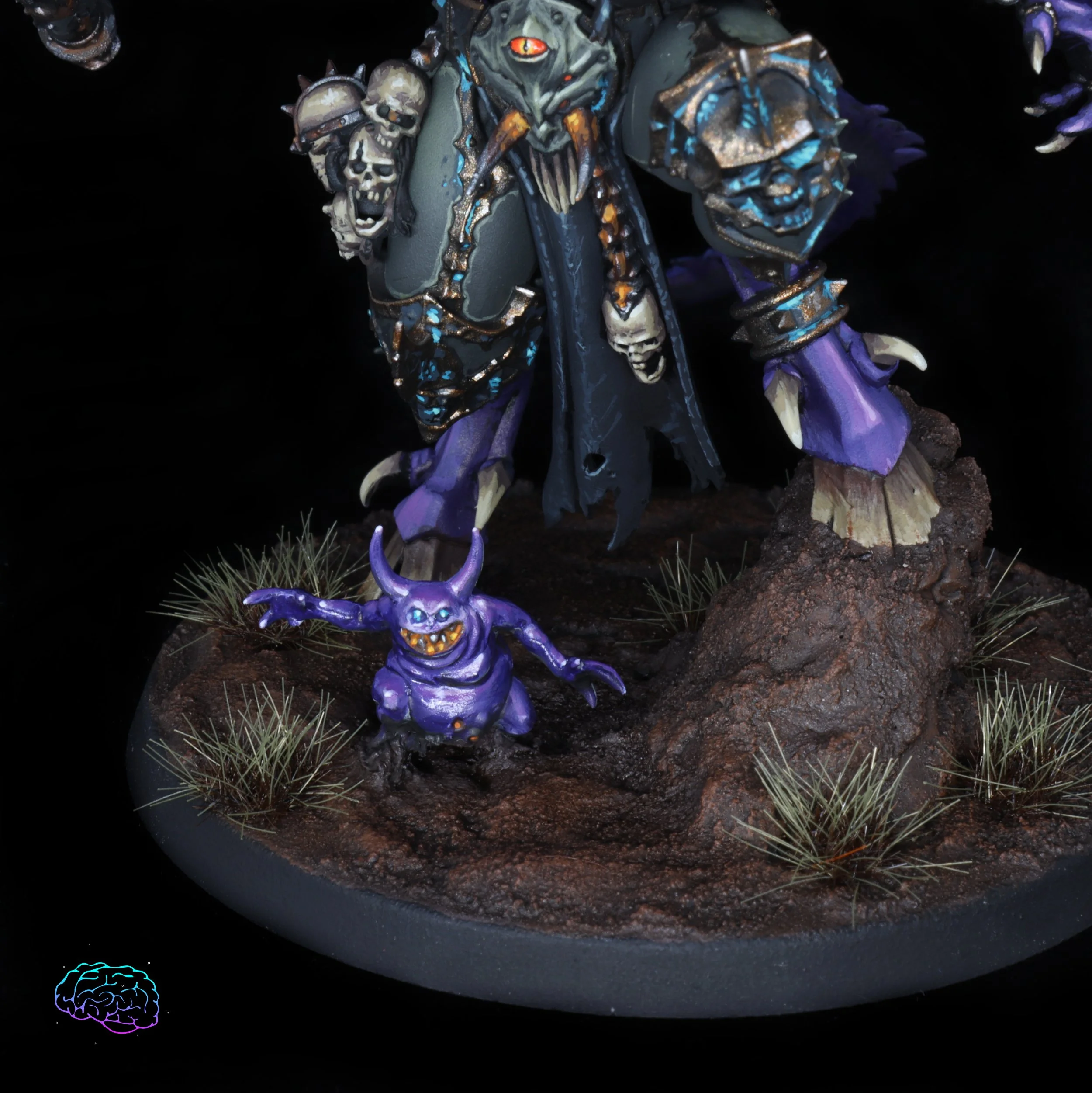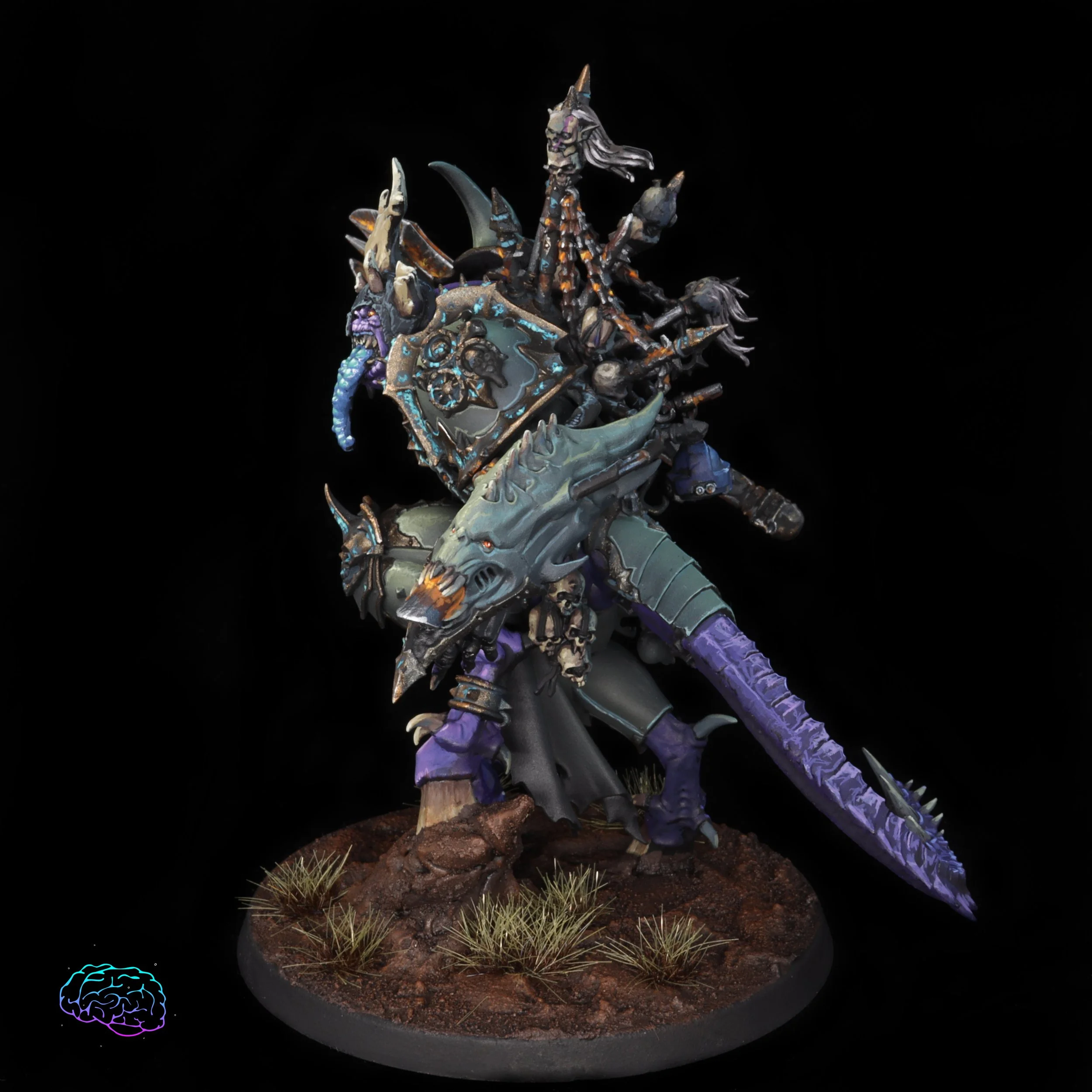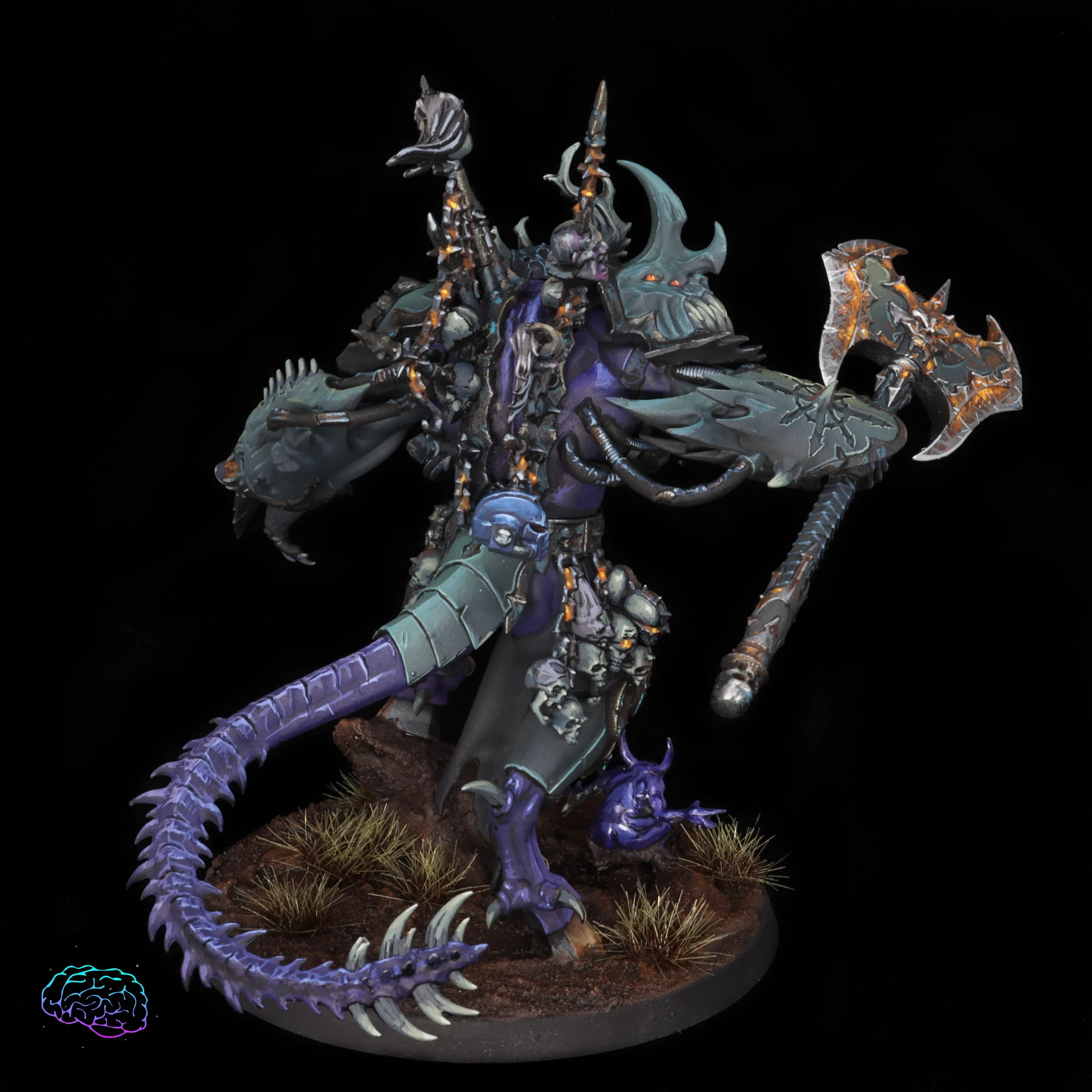 The final character for this batch of commissions, (there might be a Morty in the future- which I would love to paint in this scheme) the daemon prince on foot. I had to go with the axe and felt pretty good about my rust as I dialed it up as much as I could. I think painting super rusty things going forward I will paint them in reverse, starting with the dark brown of the rust as a basecoat for the recesses and then adding brighter orange to the middle with edge highlighting with silvers. That makes the metal feel more like the rust is being removed from this prince swinging and cutting space marines in half.