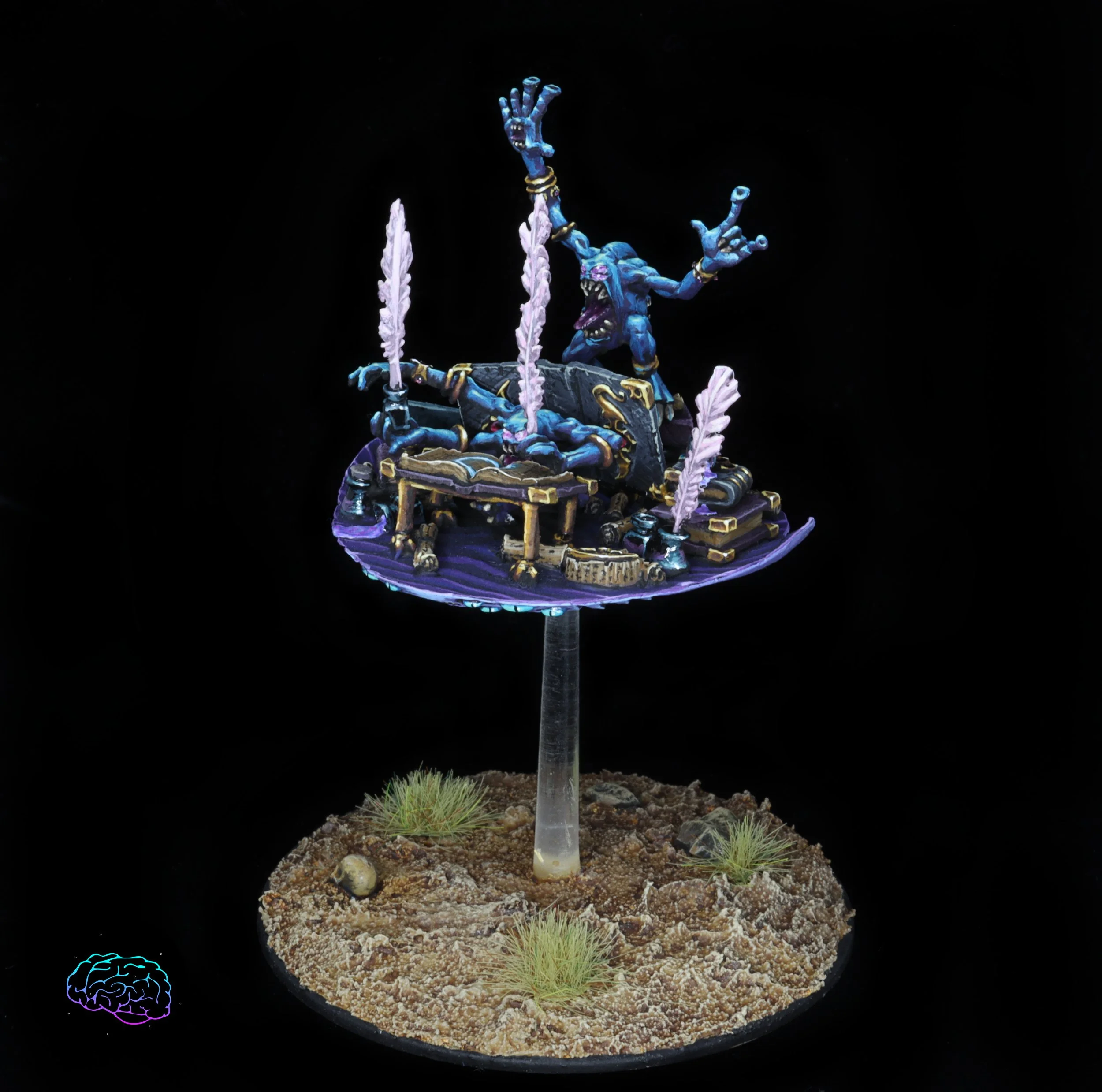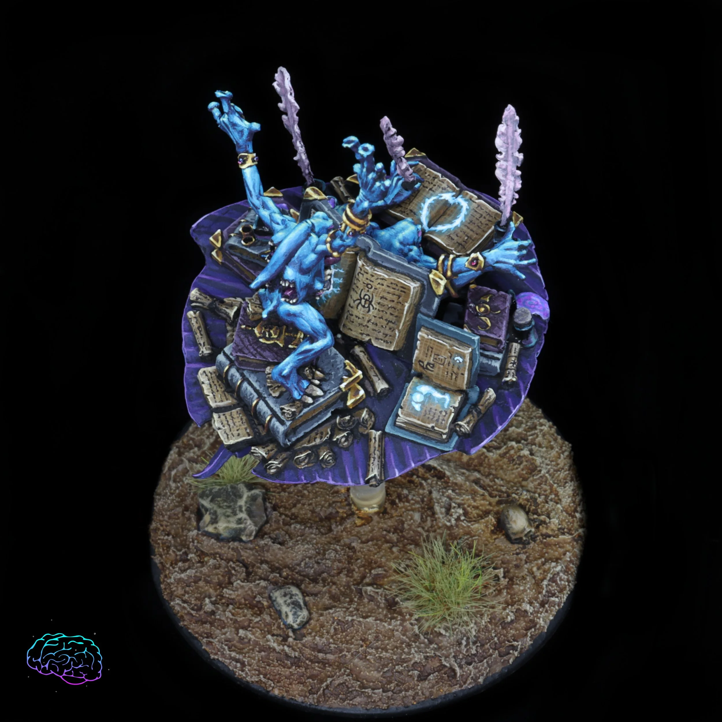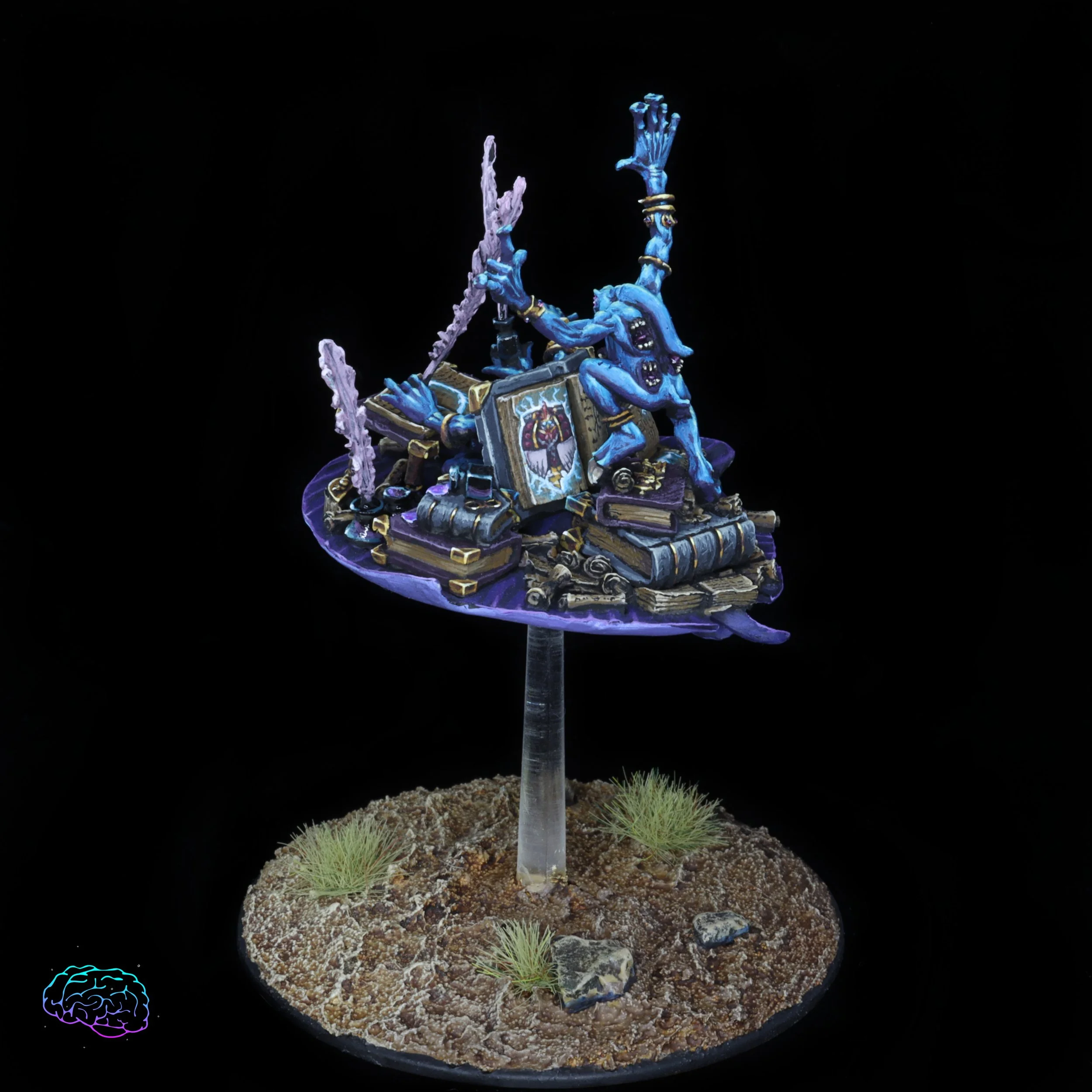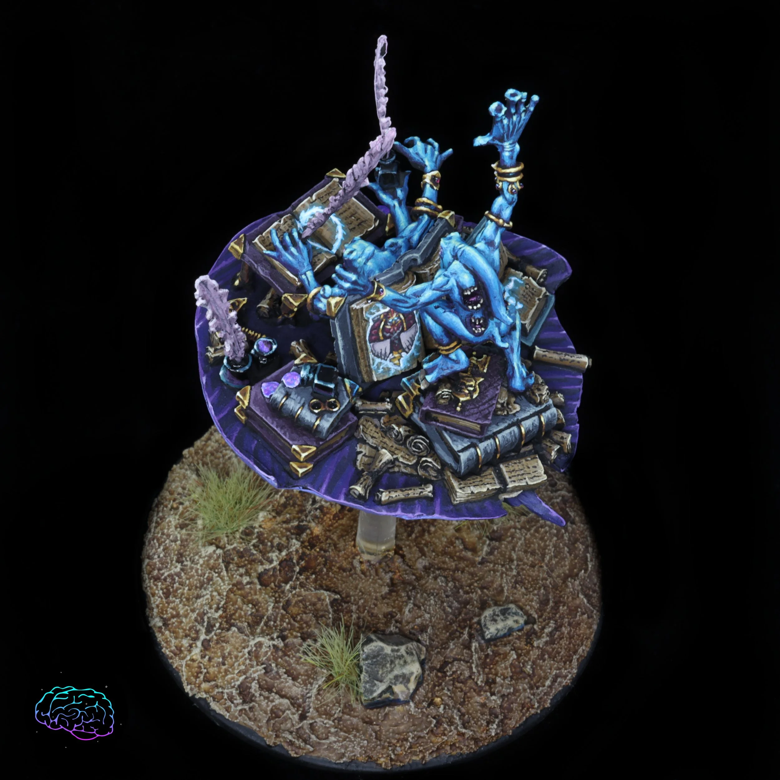 One of my favorite sculpts of all time, I was overjoyed to take a commission of The Blue Scribes. It’s the epitome of detail and freehanding so I wanted to make sure that I did the model justice. I freehanded the local playgroup’s logo onto the main spell book: The Colorado Springs Thundercluckers as the client is an active member and where I met him in the first place.